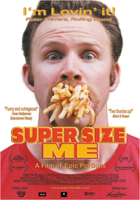 The colours used (yellow and red) are the colours of McDonalds and their slogan, “I’m Lovin’ it!” is used by Peter Travers of Rolling Stone out of context, to praise the documentary rather than the company. As mentioned, the colours represent McDonalds and the font of “ME” is very wide, perhaps to symbolise the weight that the man will gain as a result of his “super sized” diet. The tag line “A Film of Epic Portions” is a play on “epic proportions”, and again this helps to give the audience ideas of what it will be about, also hinting that it will be funny. Reviews from journalists give the programme credibility, as do the award nominations. The link to the website for the documentary allow the audience to find out more about it if they want.